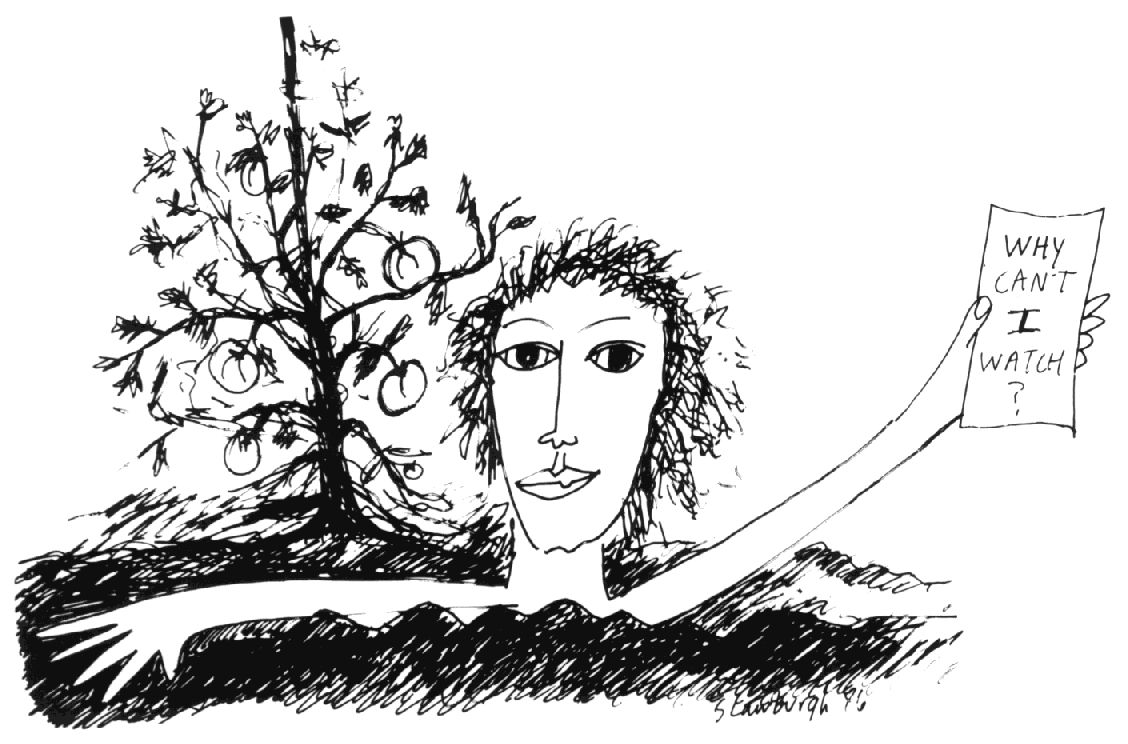 During the day his wife goes to work. He sleeps late, and when he wakes she is always gone. Today a note written with black crayon in large letters is taped to the bathroom mirror. WHY CAN'T I WATCH? I WANT TO WATCH. YOUR WIFE. The paper blocks his reflection as he shaves. He loves the simplicity of the letters and their message. "There can be no mistake what these words mean," he thinks, drying his face. He carries the note into the room where he practices and tapes it to the wall. He exercises his fingers and reads the words over and over. "Watch," he whispers, and begins.