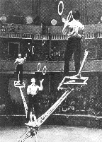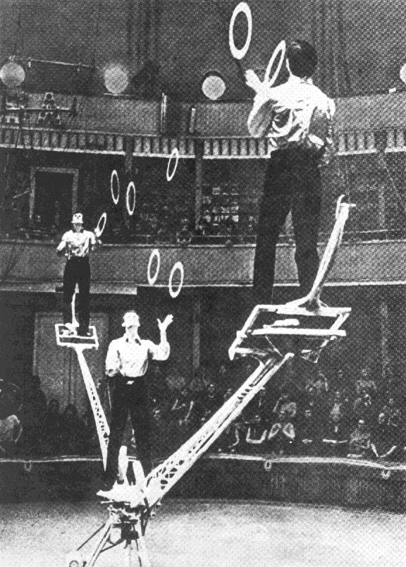 Picture Paul Conchas balancing an artillery piece on his head. Picture Paul Spadoni seated, juggling a tray, table, cup and saucer. Picture a close-up of Rastelli's powerful hands gripping a ball and a club. Picture Paolo Piletto standing on one foot on a rolling globe, spinning a hoop on the other foot, balancing two balls on pedestals and juggling five hoops.