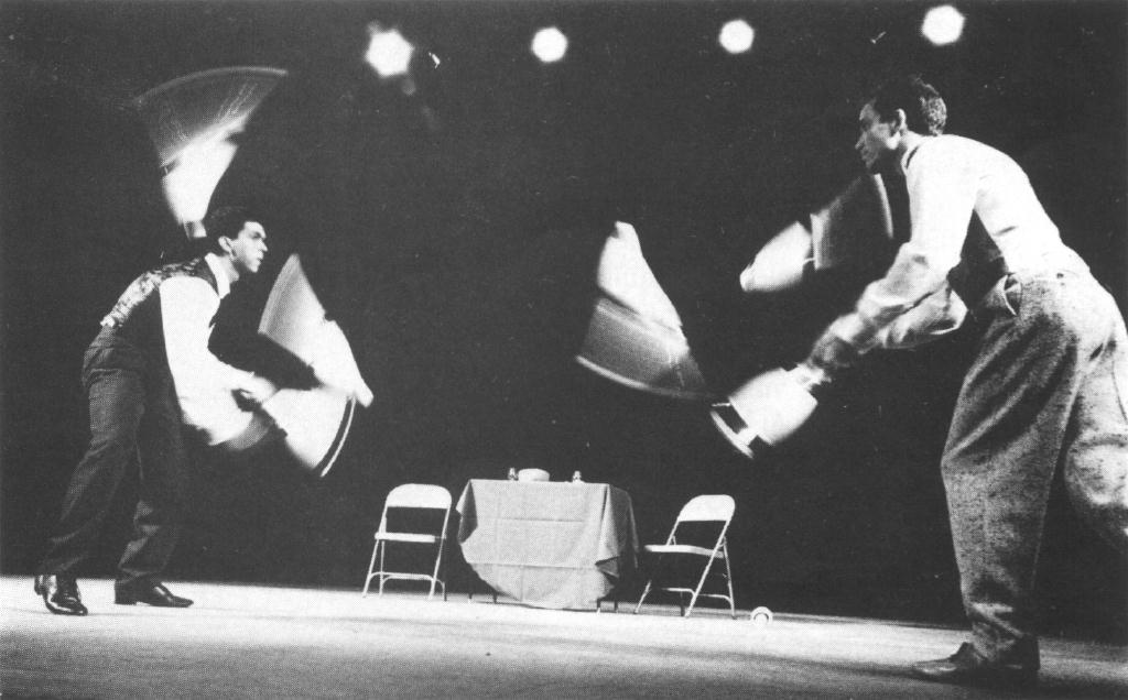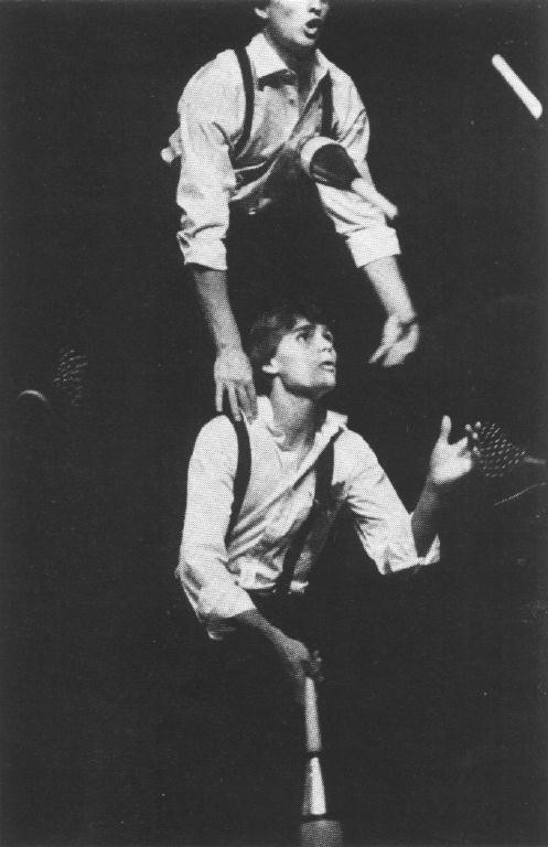Appearing on the IJA stage the night after they appeared Johnny Carson's "Tonight" show, the Raspynis also concentrated on clubs. Dan Holzman did some three club solo work while partner Barry Friedman did four clubs. They combined juggles for seven club passing and also did nine. They finished passing six machetes while each man spun a ball on a mouthstick and a ring around one ankle.
