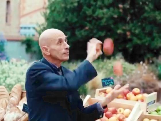 At 44:14, and over the next minute, we see Gérard Clarté approach a display of fresh fruit at an outdoor market, where he selects an apple and begins to manipulate it. He takes two more apples and showers all 3, and then switches to a cascade with several varied tricks. After finishing, he buys the 3 apples and walks away.