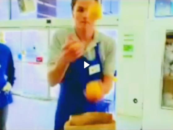 At 08:02, Paul Campbell plays Phil the bag boy, and does several tricks while bagging, including juggling 3 oranges before dropping them into the bag,