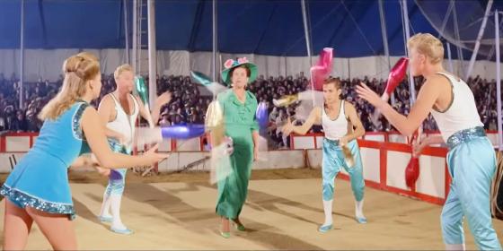 At 0:03:22, a one minute period begins with 3 different juggling acts. First, there are 3 men and a woman passing 12 clubs in a box pattern, as another woman walks through it. This is immediately followed by some foot juggling. Then a unicyclist juggles 3 clubs in the background. This is soon followed by the foot juggler again.