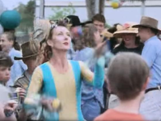 At 52:24, the kids are at the Rainbow Valley Wood-Chip Festival, and they pass Monique Allison who is juggling 3 beanbags as a clown hired to entertain people attending the event. She is seen juggling for 6 seconds, and 25 seconds later she is seen juggling again for 3 seconds.