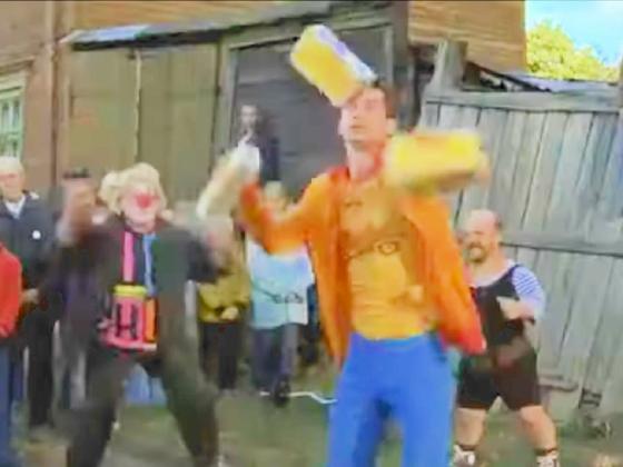 At 49:11, Kristaps Lipinskis, credited as the juggler, is seen outdoors for about 3 seconds, practicing his routine with 3 cigar boxes. About 6 seconds later, Ina Sopova, credited as the Hoolah-hoolah girl, is seen outdoors practicing her routine with silver hoops.