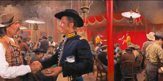At 1:58:14, two men are passing 6 clubs for 24 seconds in the background, on a stage in a saloon, possibly wearing native American costumes.