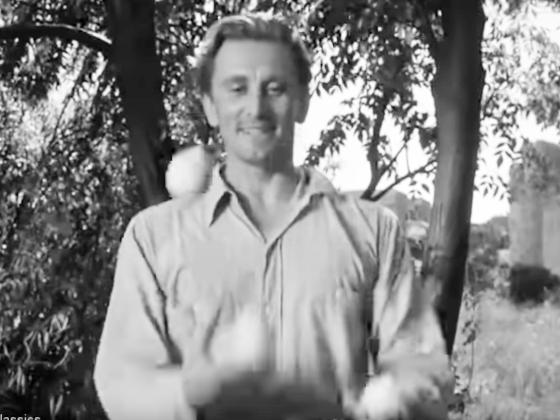 At 0:36:03, Kirk Douglas shows some skill juggling 3 apples for a minute, including a variety of tricks.