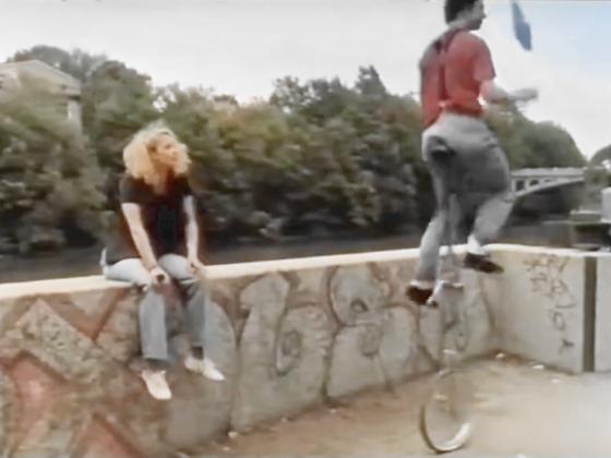 At 24:39, Gregor Kiock from Munich flips a juggling club in one hand while holding 2 more in his other hand, as he rides a tall unicycle in a park.