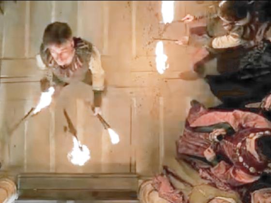 manipulates a fire devil stick. Fire juggling can be seen again in the