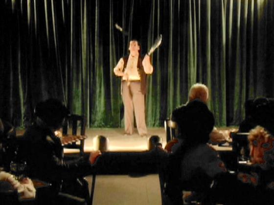 At 13:13, preceding Le Petomane on the vaudeville stage, Robert Baxt, as the Juggling Pain Man, juggles 3 machetes for 4 seconds before dropping and being escorted off the stage.