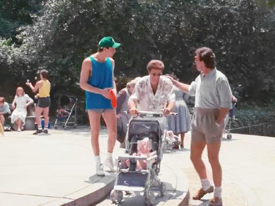 At 1:18:37, a young man juggles 3 balls in the background for 4 seconds, while Tom Selleck, Steve Guttenberg, and Ted Danson attend to the baby.