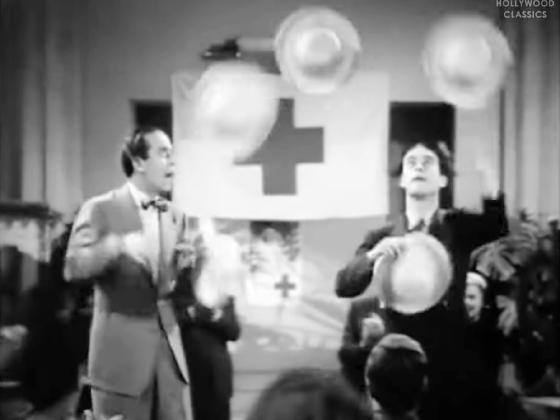 At 01:24, just after the opening titles end, Harry Johnson and Harry Johnson Jr. are seen doing a juggling act. They start by manipulating 3 hats each, and then juggle 5 hats between them, followed by fast 6 club passing, all taking just over 30 seconds.