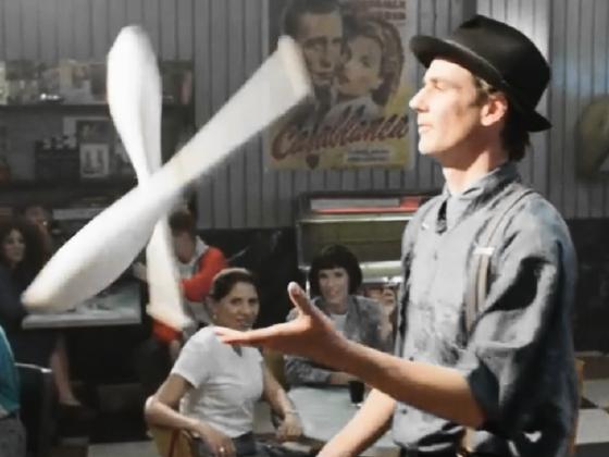 At 23:03, Daan Mackel portrays a juggler who entertains at Saül's delicatessen, seen juggling 3 clubs for 29 seconds.